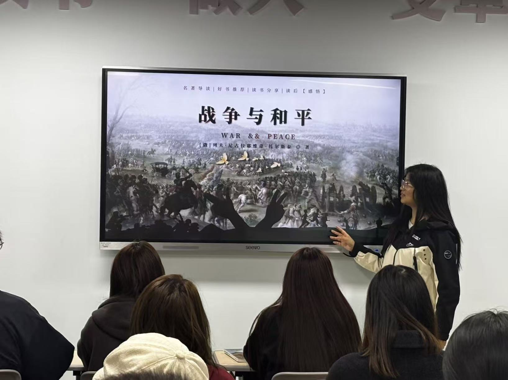 接下来分享的书籍是《战争与和平》,从托尔斯泰的宏大叙事出发,结合外语专业的文本解读能力,分析了战争背景下个体命运与人类共同情感的交织。分享的同学指出,这部作品虽描写的是拿破仑战争,但其对人性、和平的追问,与中国人民抗日战争所彰显的“命运与共、珍爱和平”的主题高度契合,展现了超越民族的反法西斯精神共鸣。