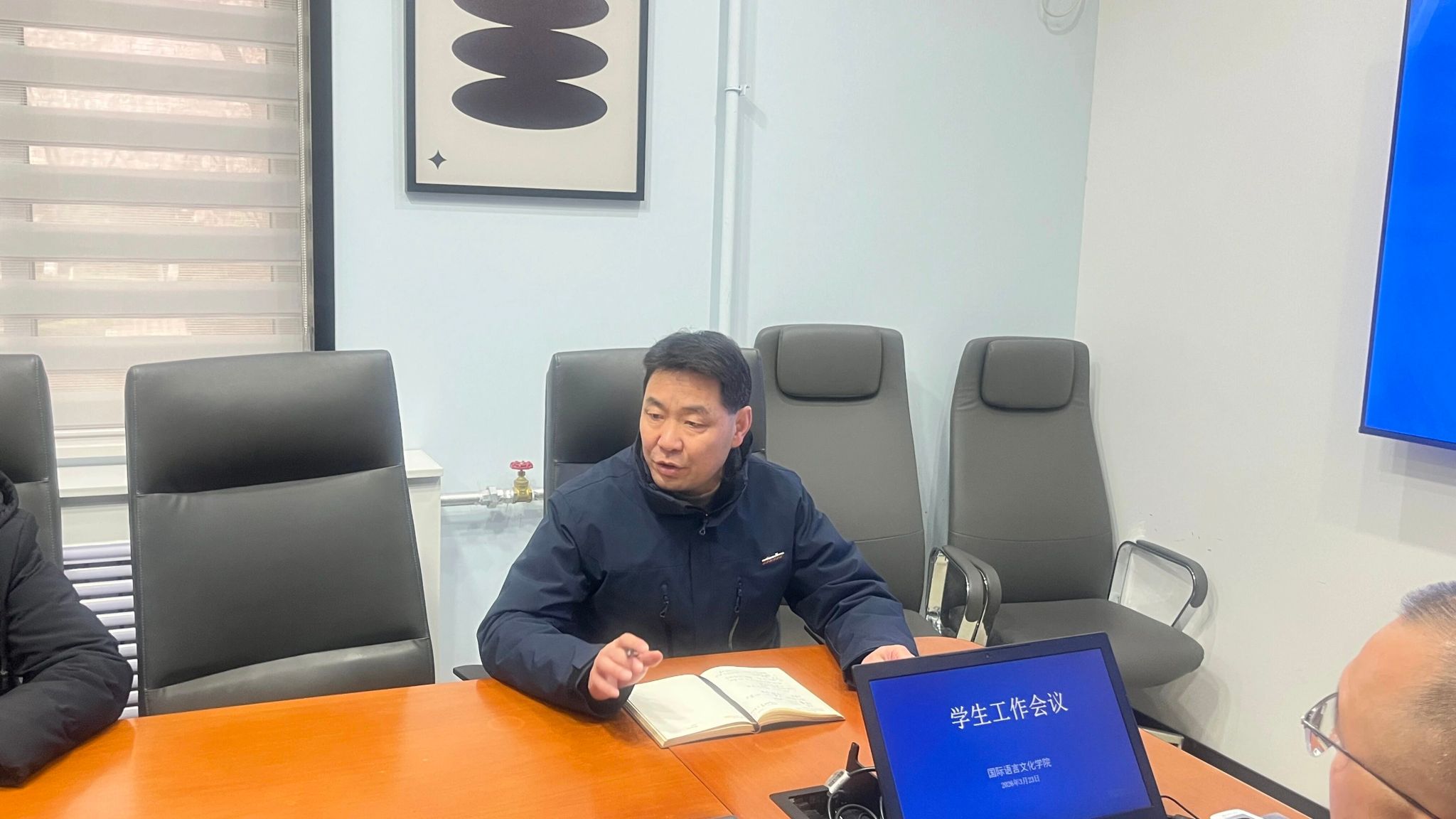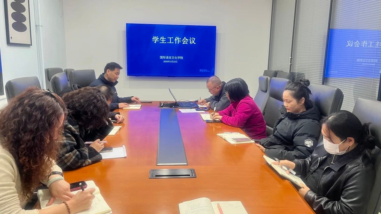 为进一步加强学生管理与服务工作,提升育人实效,2026年3月23日上午,国际语言文化学院组织召开学生工作会议。学院党委书记、副院长宇文永康,团总支书记陈福礼及全体辅导员参加会议,会议由宇文永康主持。